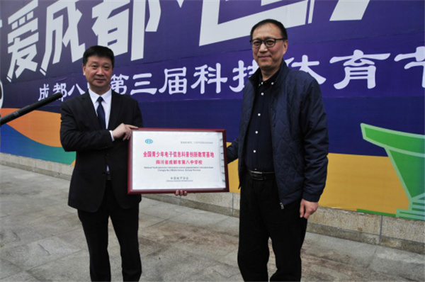 在“万众创新”的举国浪潮下,成都八中积极发展科普教育,参与创新教育领域实践,荣获中国电子学会“全国青少年电子信息科普创新教育基地学校”称号。中国电子学会普及工作委员会四川推广中心执行主任彭联华为成都八中授牌,并在讲话中说到,希望八中及其科普教师推广创新精神,发扬求真务实的科学精神,提倡同学们积极动手动脑,大胆创新;希望同学们在学校和老师的培育下博学多才,在往届取得的诸多成绩基础上,创造出更加优异的成绩。