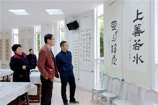 在考察特色课程的过程中,刘烨老师走进陶艺室、悦陶坊、墨香阁和扎染教室,观摩学校科技创新屋、书法展览室,对学校的特色课程给予了极大肯定。毛道生校长介绍说:学校将劳动教育和社会热点话题融入陶艺课程中,例如学生以2019年四川凉山木里森林火灾战士救火的场面与巴黎圣母院失火的情景为题材进行陶艺制作。同时将地方文化融入陶艺课程中,如“鱼凫文化”“温江文庙”等,引导学生关注社会热点,了解本地文化。学校开展教职工社团文化,丰富教职工学校生活。