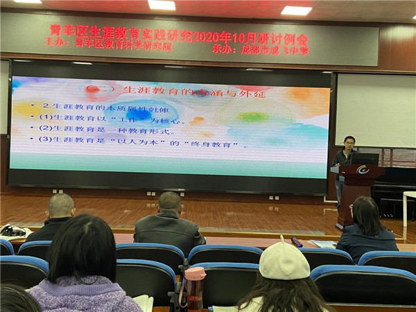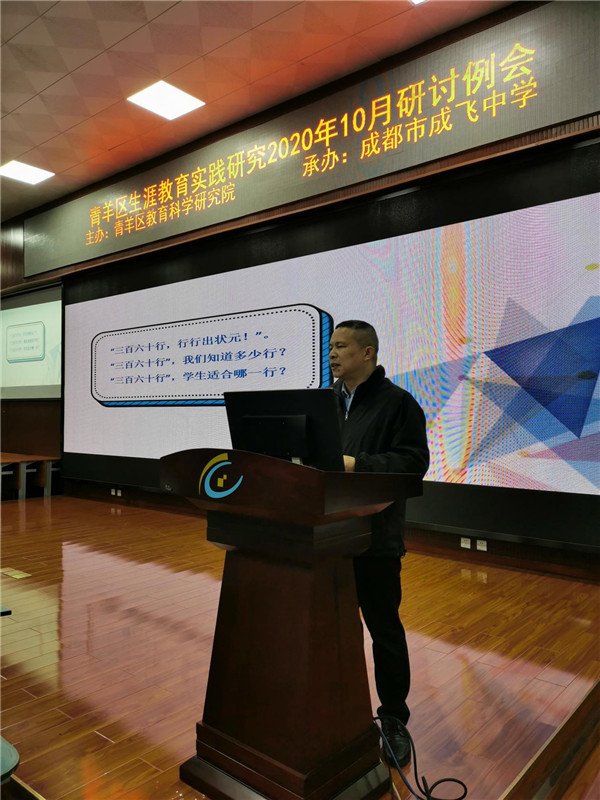 成飞中学副校长王东做了主题为《新高考改革与生涯教育》的专题分享。王东副校长谈到,高考改革将对生涯教育带来新的挑战,当下,学校面临着更新观念、顶层设计的问题。王东号召“人人参与生涯教育,人人都是生涯导师”,教师要唤醒学生内在动力,帮助学生形成自主选择的能力,同时立足课堂,开展广泛的生涯教育。