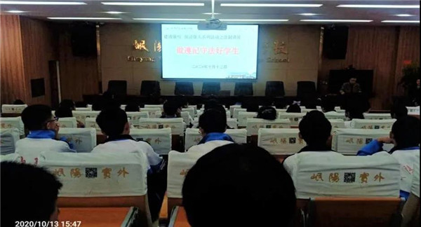 9月底,岷阳实外邀请郫都区人民检察院检察官梦菲到校以案说法,对师生进行警示教育。同时根据当前未成年人法制和安全意识薄弱的特点,结合生动的案例,以法论事,对学生进行法制教育,不断提高学生法律意识、安全素质,做一名遵纪守法的好学生。