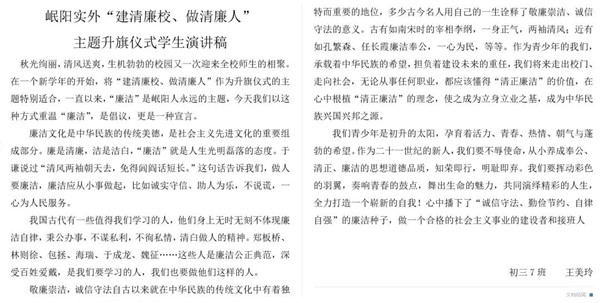 九月初,新学期伊始,岷阳实外积极开展以“创清廉校,做清廉人”为主题的升旗仪式。不仅让全体师生树立起以德立身、清正廉洁的意识,同时鼓励全校师生行动起来,做清廉文化的学习者、实践者和传播者,让廉洁的清风吹遍校园、家庭和社会的每一个角落。