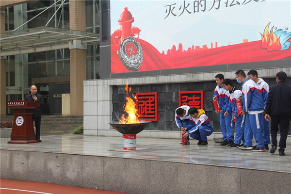 随后,全校师生通过观看《消防安全知识》《干粉灭火器使用方法》两个视频和高一年级6名同学的现场灭火实际操作演示,直观了解到,在发生火灾后应该如何冷静应对危险、如何正确面对火灾以及如何正确使用灭火器。