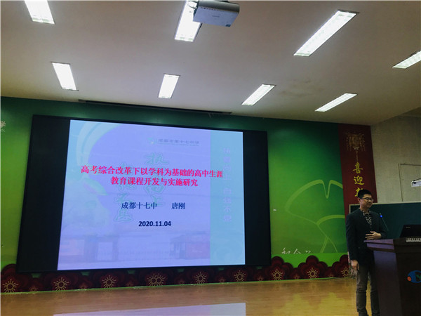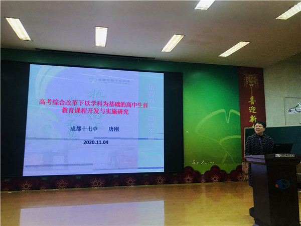 会上,成都十七中《高考综合改革下以学科为基础的高中生涯教育课程开发与实施研究》课题负责人唐刚老师首先就课题研究的背景、目的意义、主要内容、课题的现状分析与主要研究方法、研究过程及预期研究成果等作了详细的汇报。
