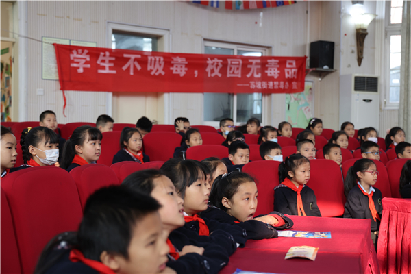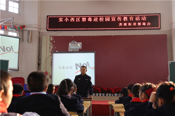 为进一步增强学生防范毒品的安全意识,提升学生甄别毒品的能力,加强以青少年为重点的全民禁毒宣传教育,让毒品远离校园,为在校学生营造良好的成长环境,11月9日,苏坡派出所程警官、苏坡街道禁毒办走进成都市实验小学西区分校(以下简称:实小西区),为同学们送来以“向毒品说no”为主题的丰富禁毒知识大礼包。