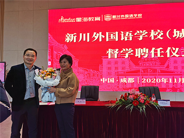 新川外国语学校创办人陈星海先生向龚鸿校长送上鲜花