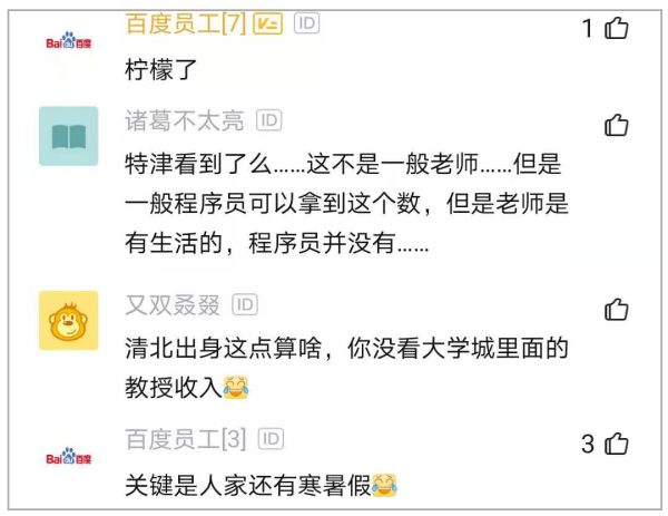 不过,也有人认为,这位“普通的”教师和程序员没有可比性:互联网这个资历的,早就年薪千万了,拿别的顶尖的和初级的比,呵呵;你来个p8的收入那也能秒杀大多数教师啊……拿一个行业里的强者真不知道有什么说服力