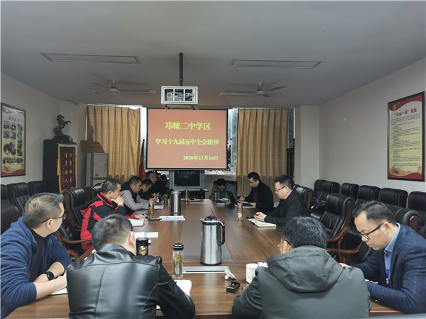 为深入贯彻落实党的十九届五中全会精神,扎扎实实推进学习宣传贯彻工作,2020年11月16日,邛崃二中学区召开党的十九届五中全会精神专题学习会。会议由邛崃二中党支部书记、校长何守蔚主持,邛崃二中学区各学校校长、党支部书记参会。