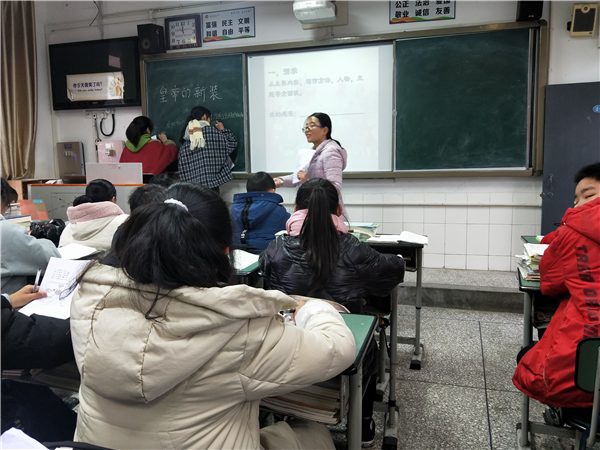 吴老师呈现七年级上册第五单元课文《皇帝的新装》,采取小组合作学习的方式,围绕品析人物形象为重点,领会童话所揭示的人性弱点。通过预学、共学、延学三个板块有机组合,对文章进行了深入研读与分析。吴老师对课文精确把握,教学语言幽默风趣,整堂课学生积极参与其中,达到教师乐教、学生乐学的状态。