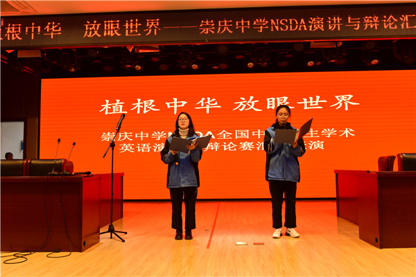 2020年12月14日,崇州市崇庆中学举行主题为“植根中华,放眼世界”的NSDA全国中小学生学术英语演讲与辩论汇报表演赛,全体英语教师和来自高一、高二的学生代表共计两百余人现场观摩。崇庆中学副校长杨晓东参与了比赛策划,并与副校长杨加健、校长助理崔永波和张勇共同观摩比赛。