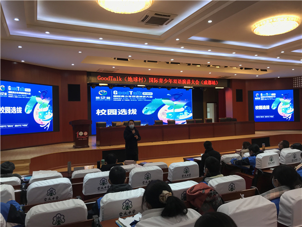 2020年12月19日,崇州市崇庆中学举行GoodTalk(地球村)国际青少年双语演讲大会,来自高一年级一百余名学生参加比赛。崇庆中学副校长杨晓东参与比赛策划,校长助理崔永波作开赛致辞并观摩比赛。