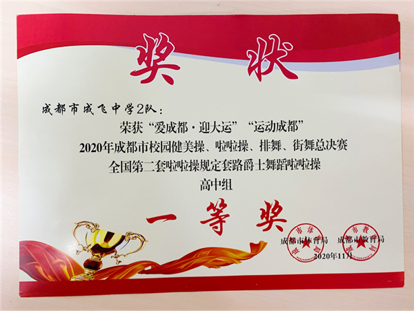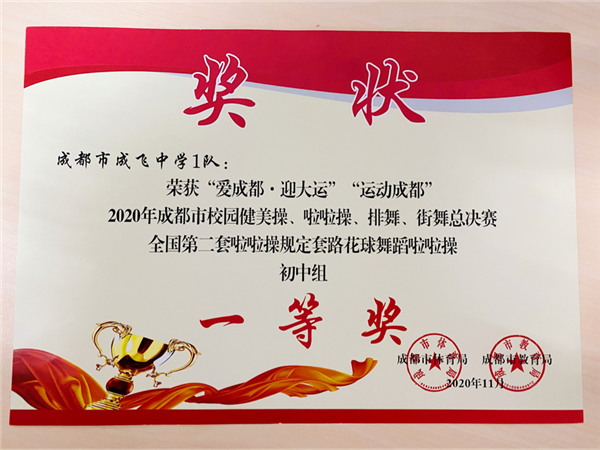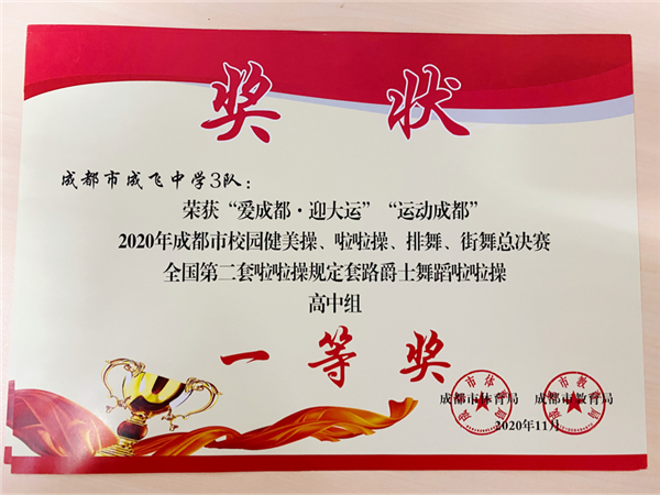 “爱成都•迎大运”“运动成都”2020年成都市校园健美操、啦啦操、排舞、街舞总决赛于12月圆满落下帷幕。因新冠肺炎疫情防控工作要求,本着科学防控、有序组织的原则,本次赛事采取了线上比赛的方式进行。成都市成飞中学共派出初、高中一共三只队参加比赛。其中,初中组1队第二套全国规定啦啦操花球和初中组2队第二套全国规定啦啦操爵士荣获“一等奖”;高中组3队第二套全国规定啦啦操爵士荣获“一等奖”。