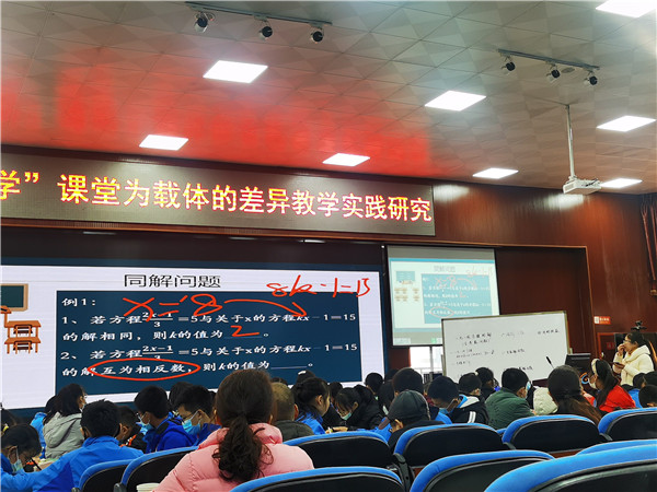 首先,胡谍老师在学术厅展示了一堂七年级新授课《一元一次方程的解(含参数问题)》,本节课立足差异,进行了差异化目标的设定、差异化提问、差异化练习和差异化评价,促成全体学生在该堂课的知识方面得到了最大限度的发展,课堂中注重提升学生的思维能力,为后期对于二元方程、分式方程等相关知识的理解做了铺垫,受到师生一致好评。