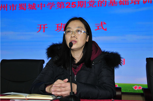 学员代表高三19班刘洋在发言中表示:“我们会珍惜这来之不易的学习机会,在培训中努力提高思想觉悟,加强自身修养,争取早日成为一名光荣的共产党员;在学习生活中发挥先锋模范作用,以自己的一言一行带动身边的同学。为自身今后的发展打下坚实的基础,为实现‘学生成才,教师成功,学校发展,社会认可’的‘蜀中梦’做出应有的贡献,为‘国家富强,民族复兴,人民幸福’的‘中国梦’尽我们的责任,做一名思想政治素养高,文化知识学得好的优秀蜀中学子!”开班仪式后,本次党训班的班主任熊国香老师给同学们上了第一堂党课。