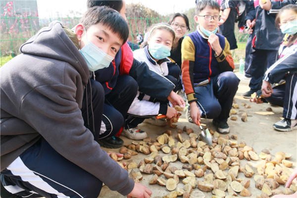 有的同学脱掉厚重的外套、挽起衣袖,有的同学拎着小桶、手握小铲,迫不及待地走进田间地头,开始动起来。在种植指导员爷爷的帮助下,同学们先播种,再施肥,然后覆土。