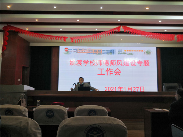 2021年1月27日,成都市青白江区姚渡学校组织全体教师召开师德师风建设专题工作会,通过强化宣传、学习内化、自查自纠、巩固提升,进一步健全了学校师德师风建设的长效机制。会议由王国人校长组织,朱宗文书记、郭玲副校长出席会议,全体教师参与。