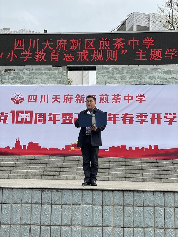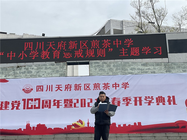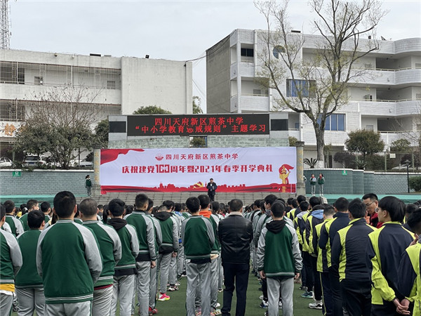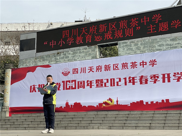 3月1日上午,四川天府新区煎茶中学全体师生齐聚运动场,举行了“庆祝建党100周年暨2021年春季开学典礼”。