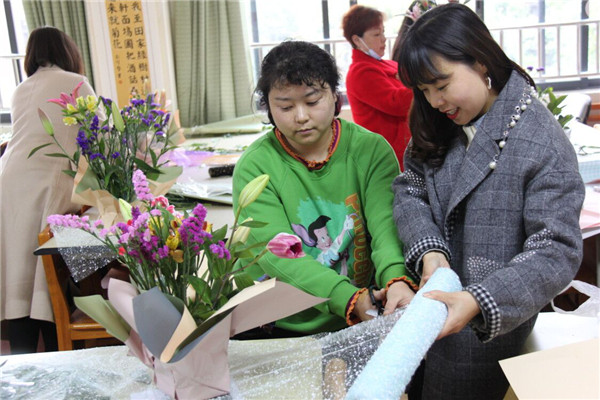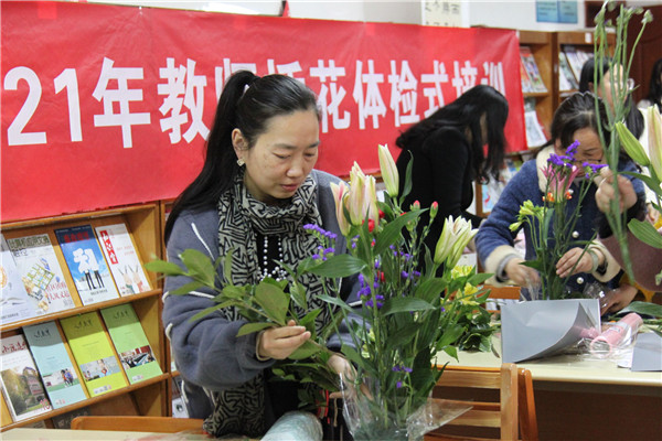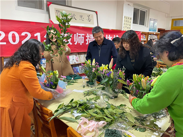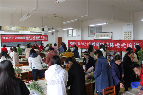 插花艺术的起源应归于人们对花卉的热爱,通过对花卉的定格,表达一种意境来体验生命的真实与灿烂。插花作品被视为一个天人合一的宇宙生命之融合。双庆中学的女教师们积极参与插花体验活动,都露出了轻松自在的笑容。老师们彼此帮助,其乐融融,仿佛一个温馨和睦的大家庭。