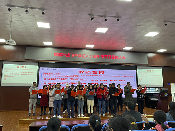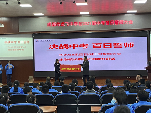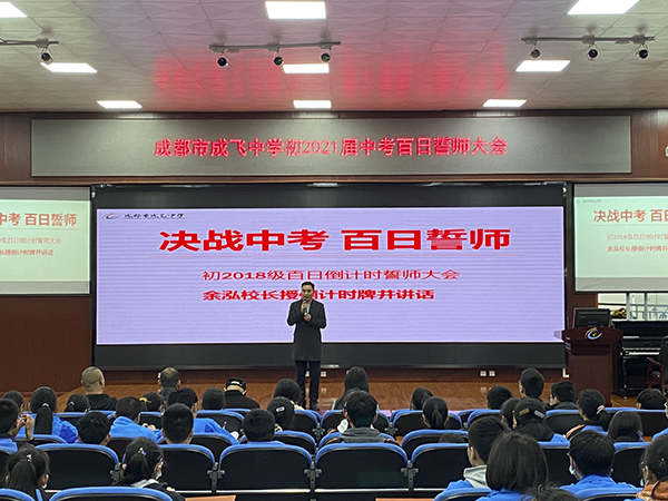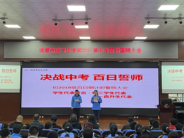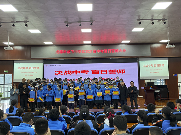 阳春三月,万物萌发,在这孕育希望的季节里,为了增强学生迎战中考的信心,形成良好的学习氛围,2021年3月10日下午,成都市成飞中学九年级全体师生在学术厅隆重召开了中考百日誓师大会。