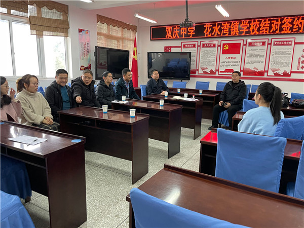 双庆中学教师深入花水湾镇学校课堂听课,并与任课教师交换意见,对几位教师的教学状态给予肯定。