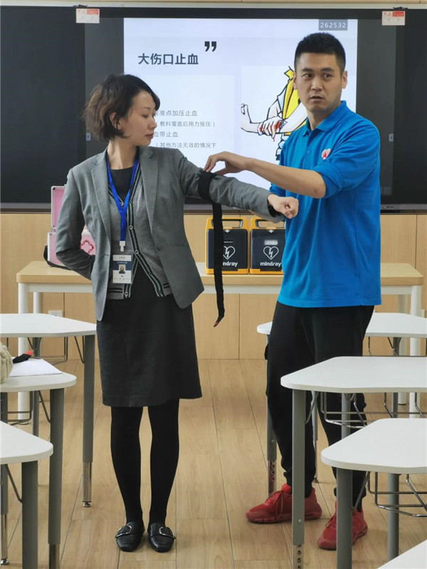 讲座现场,老师们了解了学生被蚊虫叮咬后如何进行处理,学习如何利用海姆立克法帮助孩子冲出气道异物,模拟使用止血绳处理大动脉滋血的情况。