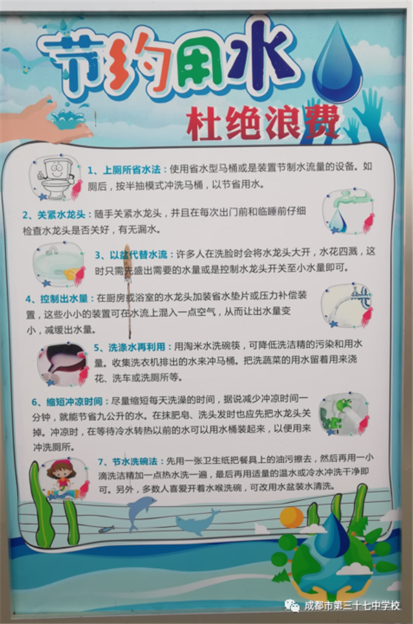 为提高全校师生节水意识和节水习惯,成都市第三十七中学组织全校师生开展了一系列节约用水宣传活动。学校充分利用升旗仪式、主题班会、led屏幕、展板等方式进行节约用水宣传;学校总务处从绿化、环境卫生和设备管理上指导后勤工作人员节约用水。如绿化用水采用喷灌的方式;节假日、夜晚关闭厕所和不常用的水龙头;加强对供水设备的日常巡查,发现问题及时检修。