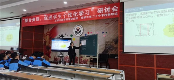 成都二十中物理教师周颖结合本次研讨会的主题上了一节展示课《液体的压强与压力》,通过创新实验与进阶式习题教学充分展示了如何在课堂上进行资源整合、分层式教学和促进学生个性化学习。