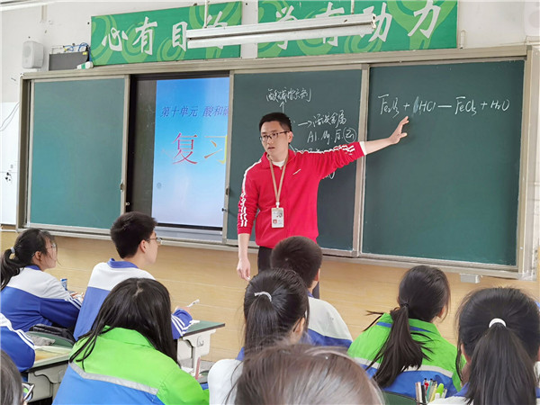 随后,晋原初中理化组教师走进课堂,观摩了成都市优秀青年教师、韩场学校教务主任胡杰老师的化学课。胡老师为大家献上了《常见的酸和碱复习课》,胡老师运用思维导图的方式帮助学生建立框架,提纲挈领,引导学生整理梳理酸和碱的化学性质,构建知识网络。整堂课目标精准,突出重点、突破难点,紧扣考点,层层递进,环环相扣,以大概念统整单元教学内容,充分体现了课堂的有效整合与深度学习。课堂上,胡老师充分调动学生的积极性和主动性,教师引导得当,学生学习主动,师生互动积极有效,课堂气氛热烈,取得了良好的教学效果。