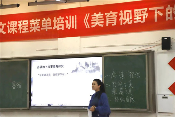 本次培训主题为“美育视野下诗歌与书法”,本校高中语文组彭小平老师从苏轼的审美观出发,引发学生思考当下社会的审美现象,献课《诗探书意——从论诗书看苏轼的书法审美观》;田刚老师则以诗歌与书法之“意”出发,提升学生对书法的审美能力,献课《“诗书共意”——步入诗书相合的艺术境界》。