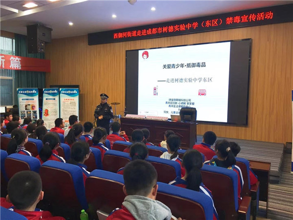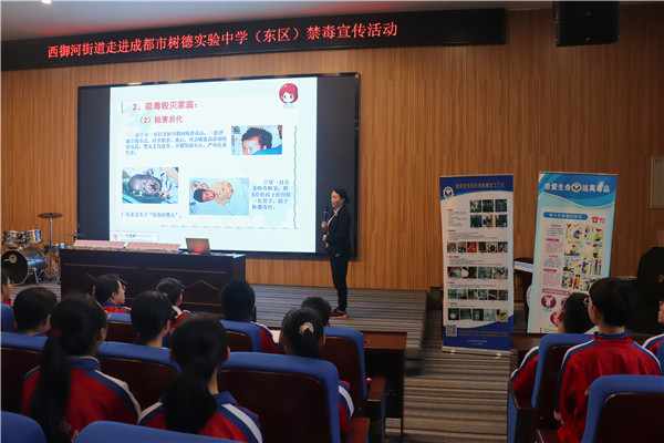 为进一步提高同学们识毒、防毒、拒毒的意识和能力,努力创建“无毒”校园,4月21日,成都市树德实验中学(东区)与西御河街道社区戒毒(社区康复)工作站、西御河街道办、青羊区西御河派出所和四川公生明律师事务所携手在树德实验中学(东区)初二年级开展禁毒宣传活动。