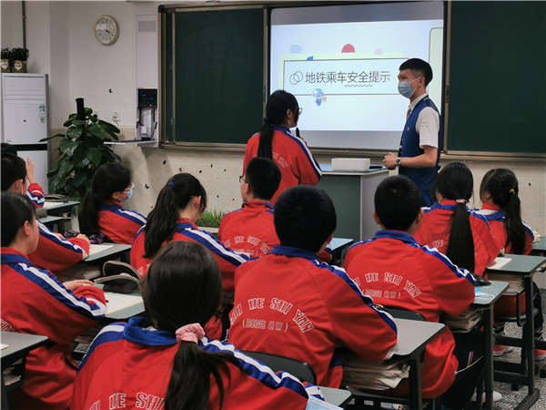 4月26日下午,成都市树德实验中学(东区)携手成都市公安局轨道公交分局勤务三支队(筹)四大队、地铁管理站以及地铁安检部门对学校八年级同学开展了法制及自我保护教育主题班会。