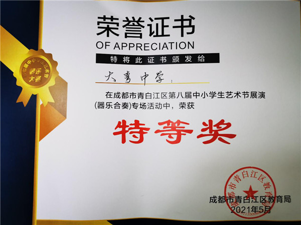 5月26日,成都市青白江区第八届中小学生艺术节器乐展演在川化中学举行,全区共有19支中小学乐队参加此次展演,经过激烈角逐,最终,大弯中学管乐团荣获中学组特等奖。