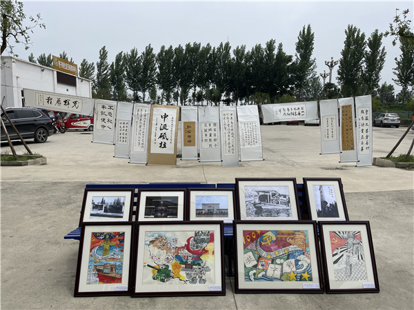 明媚的阳光下,在枣子树村党委办公室前,中共四川省彭州中学委员会在此举办了红色书画展览,这些书画都是彭州中学师生的作品,每一幅都表达了彭州中学师生热爱党、热爱祖国的情怀,展现了对伟大的党和伟大祖国的歌颂之情。村民们围绕着书画欣赏着,品论着,赞美着,喜爱着。