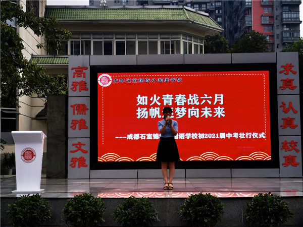 6月7日上午,成都石室锦城外国语学校举行了初2021届“如火青春战六月,扬帆逐梦向未来”中考壮行仪式。德育处杨文娟主任主持本次仪式。