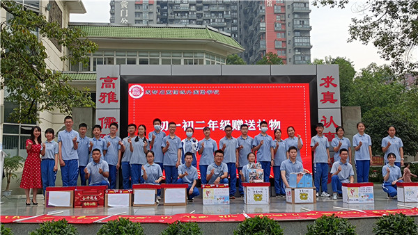 仪式第三项,初一初二年级赠送礼物。在歌曲《年轻的战场》中,初一和初二年级组长带领初一初二的学生代表为学长学姐们献上礼物与祝福,祝愿初三学子在这年轻的战场中走向胜利的远方。“桃花潭水深千尺,不及汪伦送我情”,一句句真挚的祝福,一个个不平凡的心意,为初三考生带来了无穷的力量。
