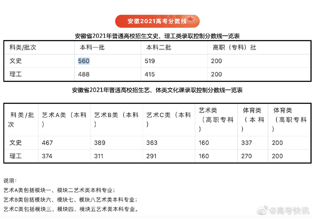文史本一批560分,理工488分!安徽2021年高考分数线出炉