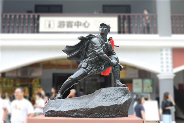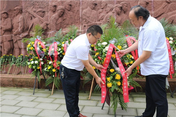 活动在嘹亮的国歌声中拉开序幕,大弯中学初、高中党支部党员同志们齐唱国歌,表达着对祖国的无限热爱和对革命先烈的无限缅怀。随后,党员代表为革命先烈送上花篮,整理挽联,随即是默哀。这无声的“对话”,是最深沉的“告白”和最有力量的誓言。默哀毕,深深的三鞠躬表达着大弯党员们对革命先烈最崇高的敬意。接下来,大弯中学党委副书记陈进带领全体党员重温入党誓词,铿锵有力的誓言映衬着红色的党旗,激荡着党员干部的心情。随后,全体党员干部怀着崇敬的心情重点参观了“石塔寺区苏维埃政府旧址”。先烈抗战用的大刀,陈旧的办公用具,浮雕上长征画面的再现等等,无一不诉说着那一段被历史铭记的岁月。走在“长征路上”,党员们步履缓慢,在每一处“党史”前都驻足瞻仰,认真聆听讲解。