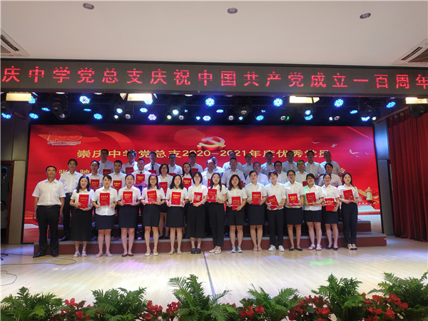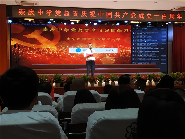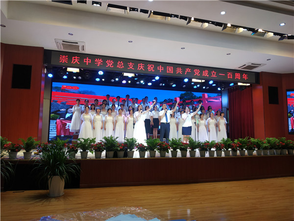 奏唱中华人民共和国国歌、全体党员重温入党誓词之后,崇庆中学校长、党总支委员任永康致辞。任校长回顾了中国共产党在近一个世纪的艰苦奋斗历程中,团结和带领全国各族人民自力更生、艰苦创业,实现了中华民族从站起来到富起来到强起来的伟大飞跃。