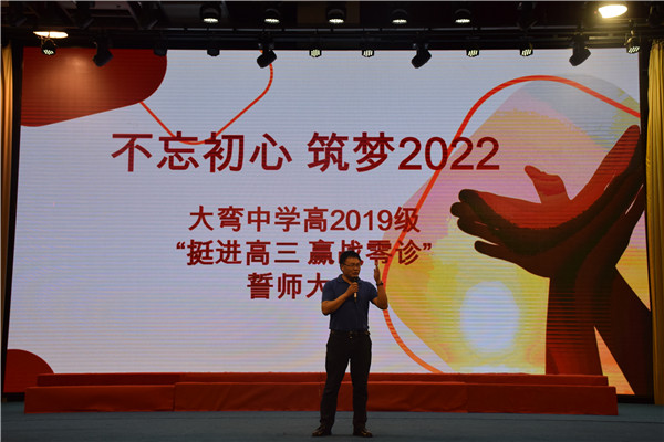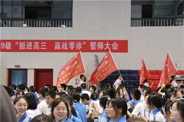 2021年高考已落下帷幕,高2019级学子将整装待发。为了进一步激发师生迎战高考的斗志,挖掘蕴藏在每一位师生内心深处的潜能,充分调动备战2022年高考的积极性,全力应对即将到来的零诊考试,2021年6月25日下午四点,成都市大弯中学高2019级全体师生和部分家长代表共同参与了在体育馆举行的以“挺进高三 奋战零诊”为主题的誓师大会。青白江区教育局党组书记、局长鲁涛,大弯中学党委书记、校长赵泽高,大弯中学副校长何晓虹,大弯中学课程中心主任王成勇等领导亲临现场为孩子们加油鼓劲。会议由高2019级年级主任周辉祥主持。