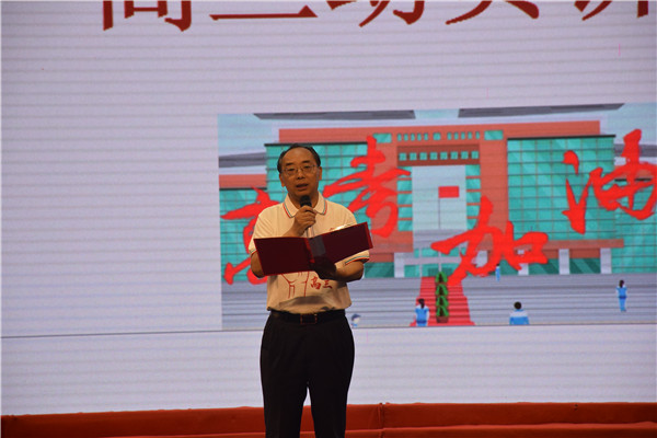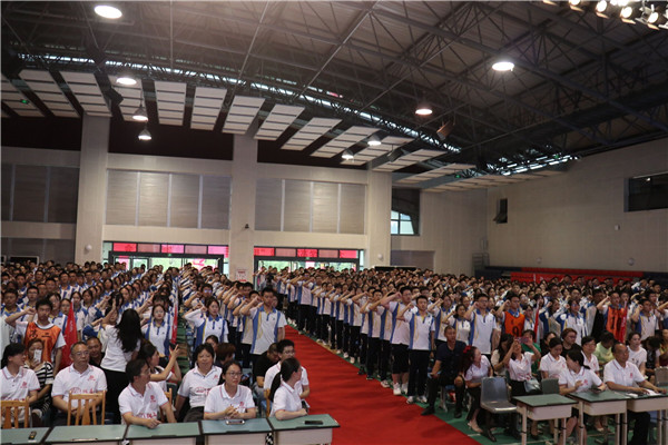 在场所有师生及家长举起右手,眼中有光,手臂有力,脚踏大地,心中憧憬着2022年的高考,语言坚定,声音洪亮。整齐划一、铿锵有力的“奋发图强,全力以赴,勤奋学习,百炼成钢”宣誓声在体育馆内久久回响。