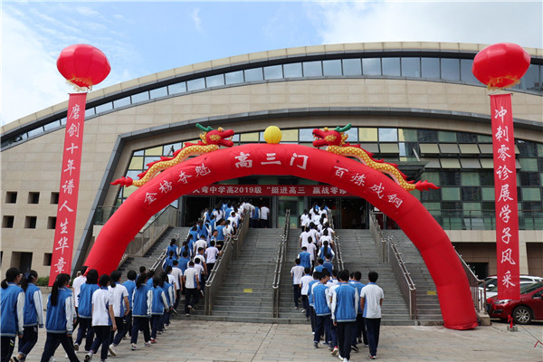 体育馆外,镌刻着“金榜夺魁、百炼成钢”的高三门大气磅礴,悬挂着“冲刺零诊展学子风采,磨剑十年谱人生华章”的氢气球竖幅迎风飘扬;体育馆内,学生手中的小红旗,各班的战旗,LED滚动播放的内容无一不是生命的呐喊,力量的跳跃。