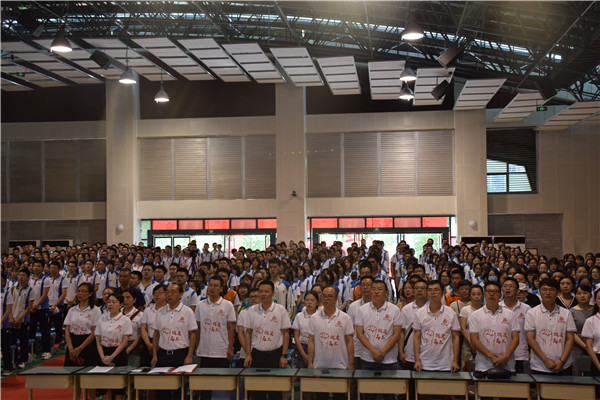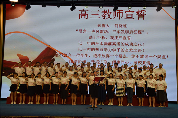 高2019级68名教师身着统一战袍,精神饱满,举起右手声音洪亮庄严宣誓。“绝不放过一个难点,决不放弃一个学生,助力每一个孩子成才”的声音不绝于耳。