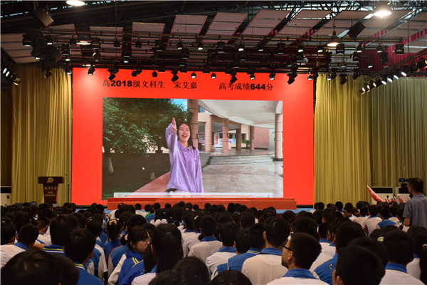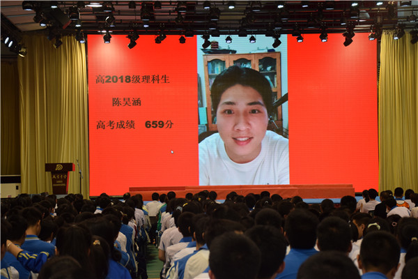 在暖场短视频里,高2018级应届学生宋艾嘉和陈昊涵两位同学代表刚毕业的学长们,鼓励学弟学妹们要不畏困难,总结规律,向高三发起冲刺,为自己美好的明天而努力奋斗。