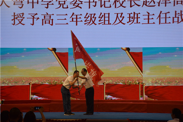 大弯中学党委书记、校长赵泽高逐一授予高三年级战旗及班级战旗,年级主任及各班班主任从赵校长手中接过战旗并沿着体育馆会场绕场一圈,瞬间点燃现场激情。