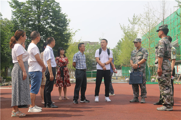 7月19日,大邑县武装部副部长邢宝申、军事科科长高宇在大邑县教育局德艺体室主任牟滟、大邑县教育局国防教育联络员吴元钊的陪同下莅临安仁中学视察军训工作。