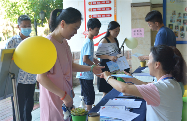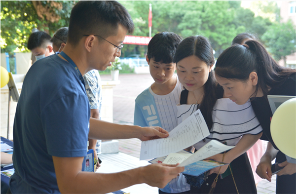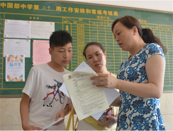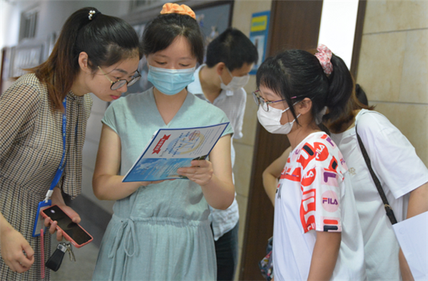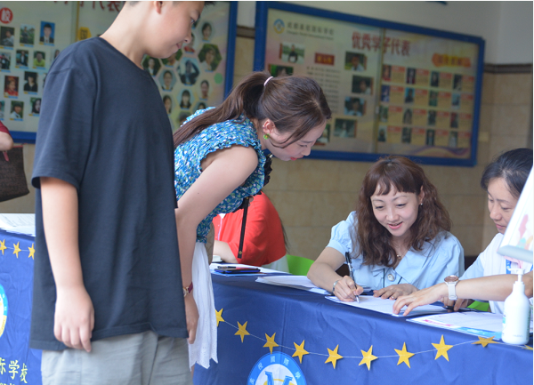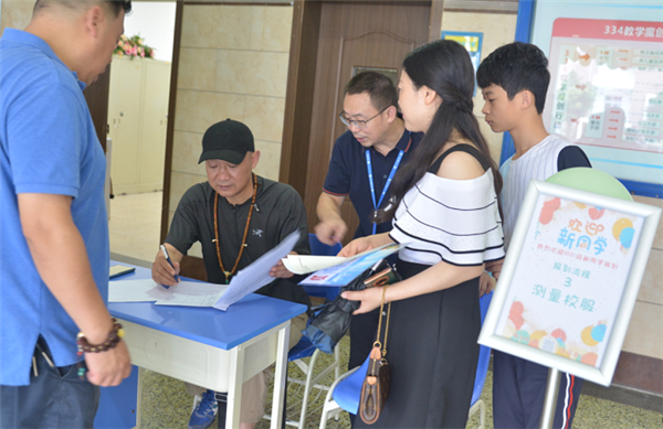 他们迎着酷暑,或为新生及家长做向导,或为新生分发录取通知书等相关资料,或为新生提供耐心细致的开学前准备事宜咨询和住宿问题答疑,各项工作有条不紊,现场秩序井然。学校领导宋伟校长、教育处韩智慧主任等到报到现场看望新生和工作人员。