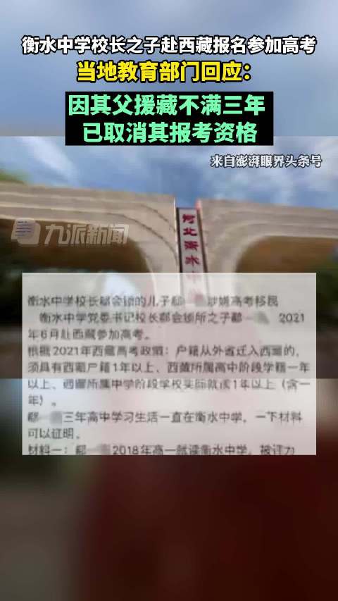 近日,河北衡水,有人发帖举报衡水中学校长郗会锁之子郗某某赴西藏报名高考,被指“高考移民”。西藏教育考试院称,郗某某户籍在藏但其父援藏未满三年,已取消其报考资格。