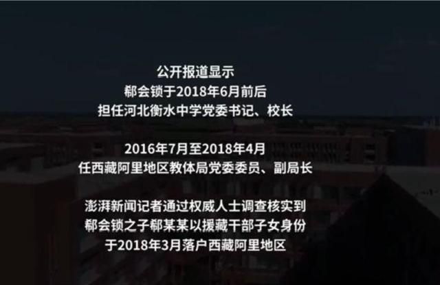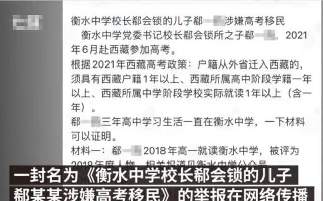 这封名为《衡水中学校长郗会锁的儿子郗某某涉嫌高考移民》举报文章指出,衡水中学党委书记、校长郗会锁之子郗某某高中三年学习生活一直在衡水中学,却于2021年赴西藏参加高考。举报称,此举涉嫌违反西藏、河北两地的教育厅相关政策以及教育部的相关规定。