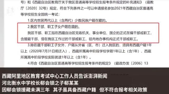 西藏阿里地区教育考试中心工作人员告诉澎湃新闻,河北衡水中学校长郗会锁之子郗某某因郗会锁援藏未满三年,其子虽具备西藏户籍,但不符合报考相关政策,已取消郗某某高考资格。
