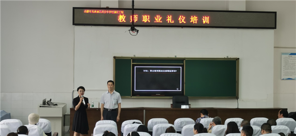 为进一步加强师德师风建设,塑造文明儒雅的教师形象,2021年8月26日上午,成都市龙泉驿区洪安中学校在阶梯教室举办了专题讲座——《教育职业礼仪》。本次讲座由国际注册高级礼仪培训师张力老师主讲。培训内容共分为四个部分:得体的着装、优雅的职业仪态、有效的沟通、关于职业与志业。