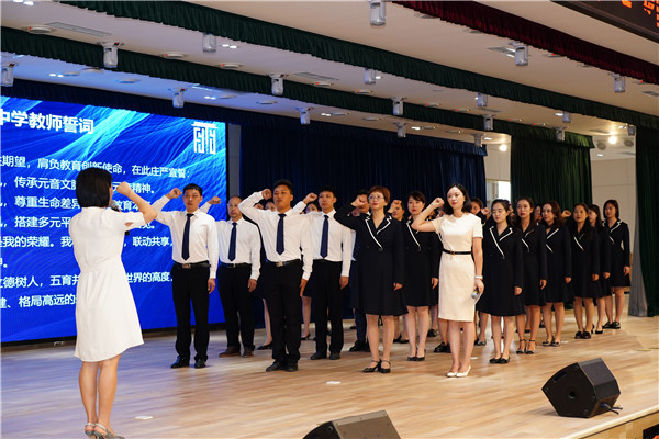 “我是元音中学教师,承载新区百姓期望,肩负教育创新使命,在此庄严宣誓——”篇章的最后,李佳琰校长带领元音教师上台宣誓,铿锵的誓言,展示出元音教师们赤诚的初心。
